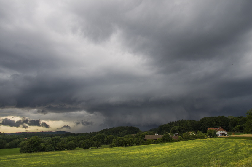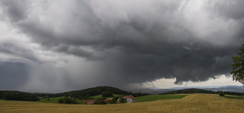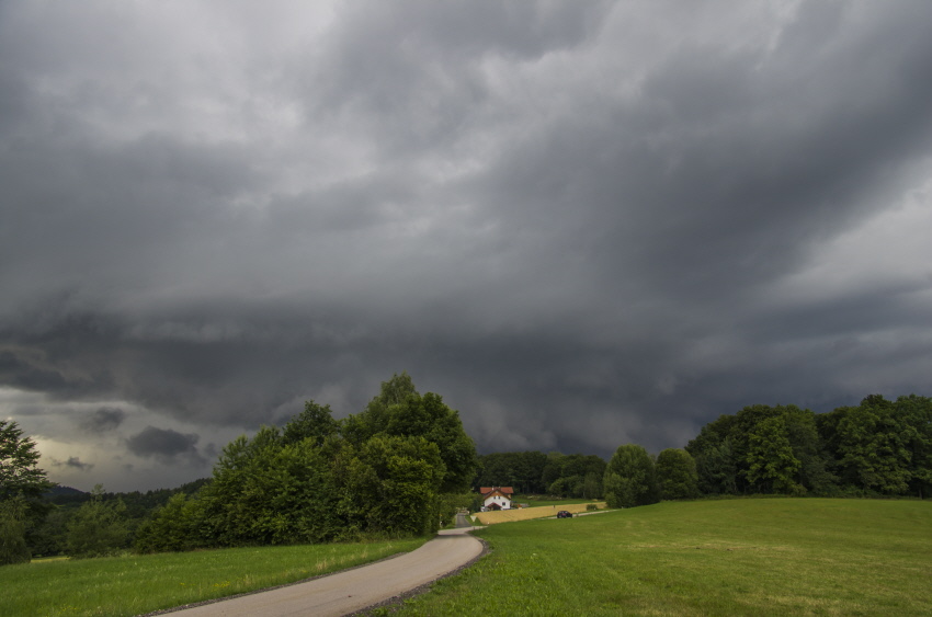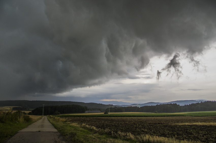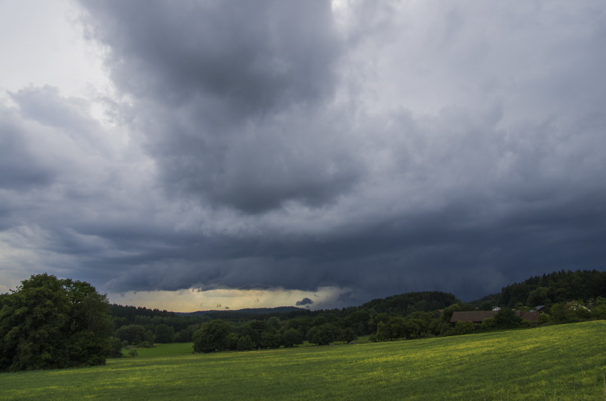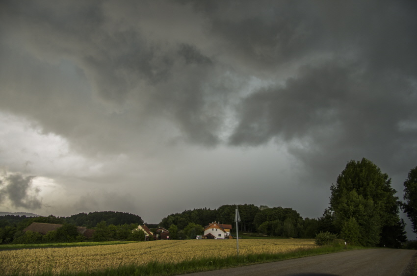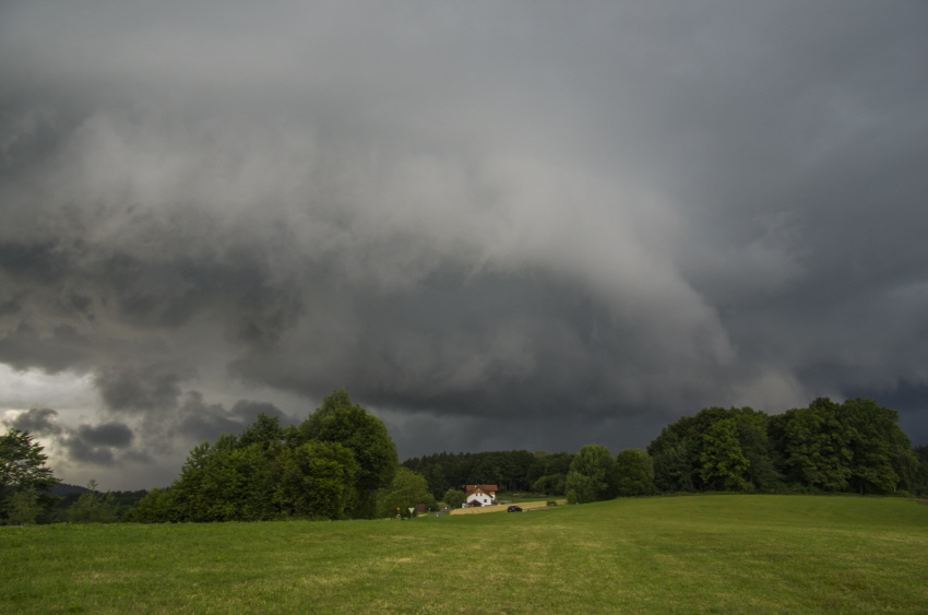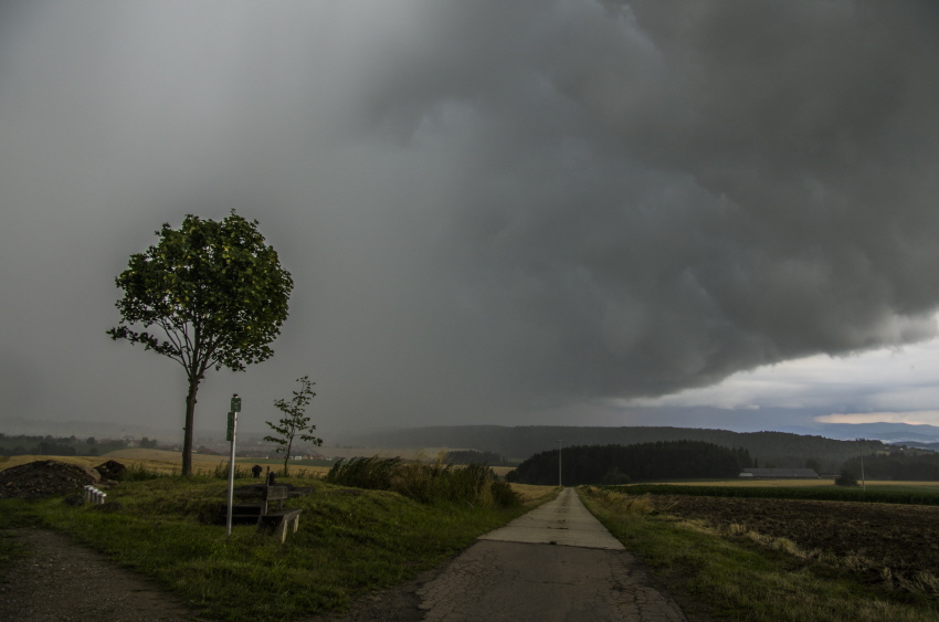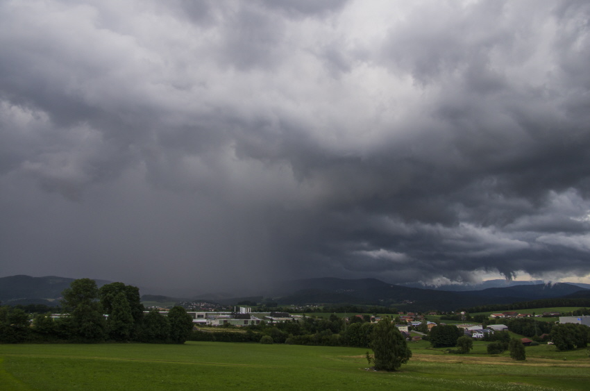 Für den WM-Finaltag war ja wieder mal was vorhergesagt, danach sahs aber vorerst nicht aus. Die Gewitterzellen entstanden und zerfielen sofort, des Chasers Alptraum eben^^ Immer am Radar auf der Suche nach einem stabilen Niederschlagskern, keimte dann Hoffnung westlich von Regensburg auf. Also rauf auf die Autobahn Richtung Westen, ich kam aber dann doch bloß bis Wörth an der Donau. Also rein in den Wald, und noch einige Kilometer Richtung Norden nach Falkenstein, damit ich dann das Südende derwischen konnte Der Beobachtungsstandort war aber ned so toll, da könnte man schon verzweifeln bein den vielen Hügeln im Bayerwald.....